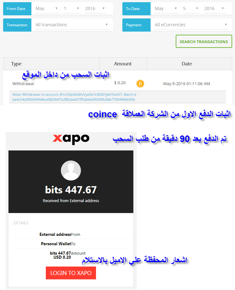 . . اثبات دفع اليوم بتاريخ 2016/5/6 من الشركة العملاقة coince استثمر في المضمون وضاعف اموالك خلال 90 يوم واسحب ارباحك يوميا الاثبات بالصورة التالية http://irba7.com/upload/do.php?img=4653 رابط هاش عملية الدفع للتأكيد https://blockchain.info/tx/007257587...887784c832ebe1 مع تمنياتي بالربح الوفير للجميع . . |