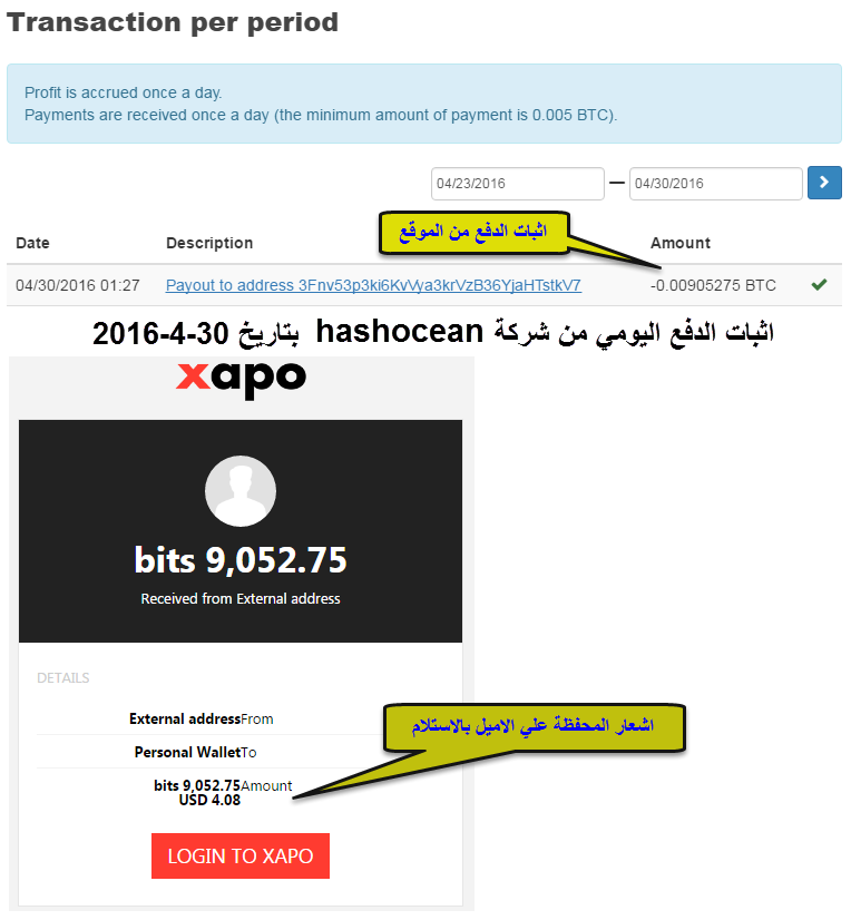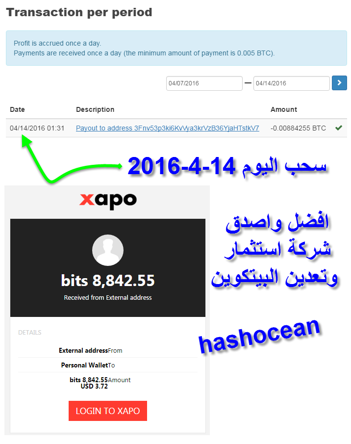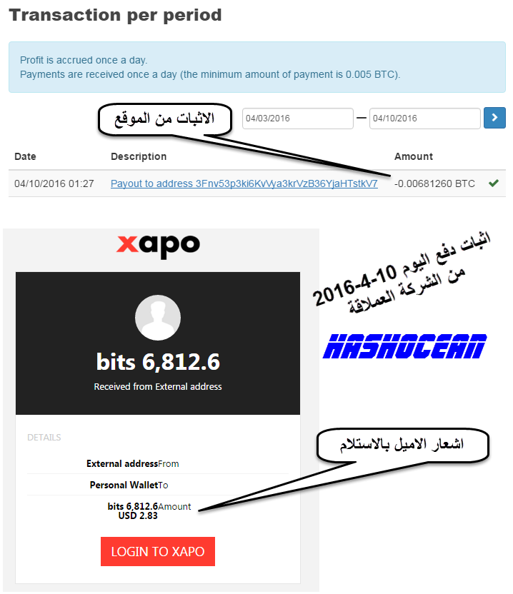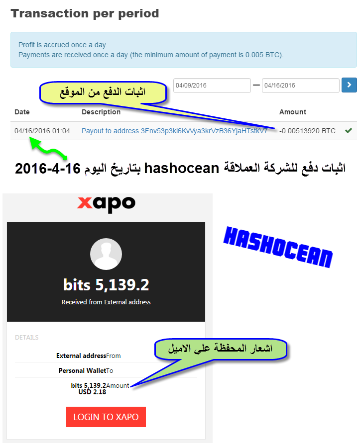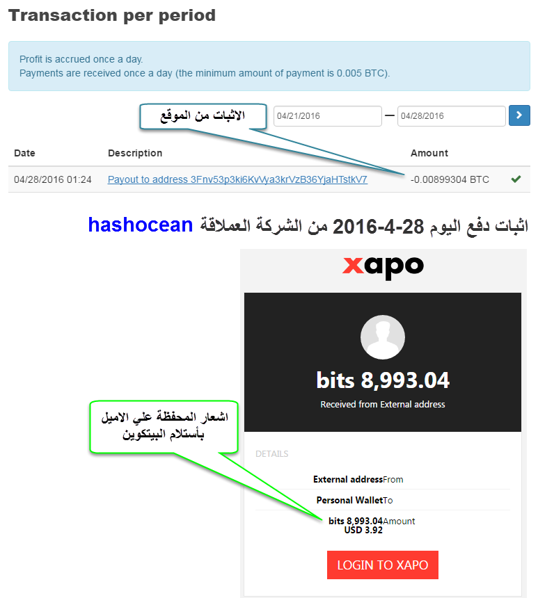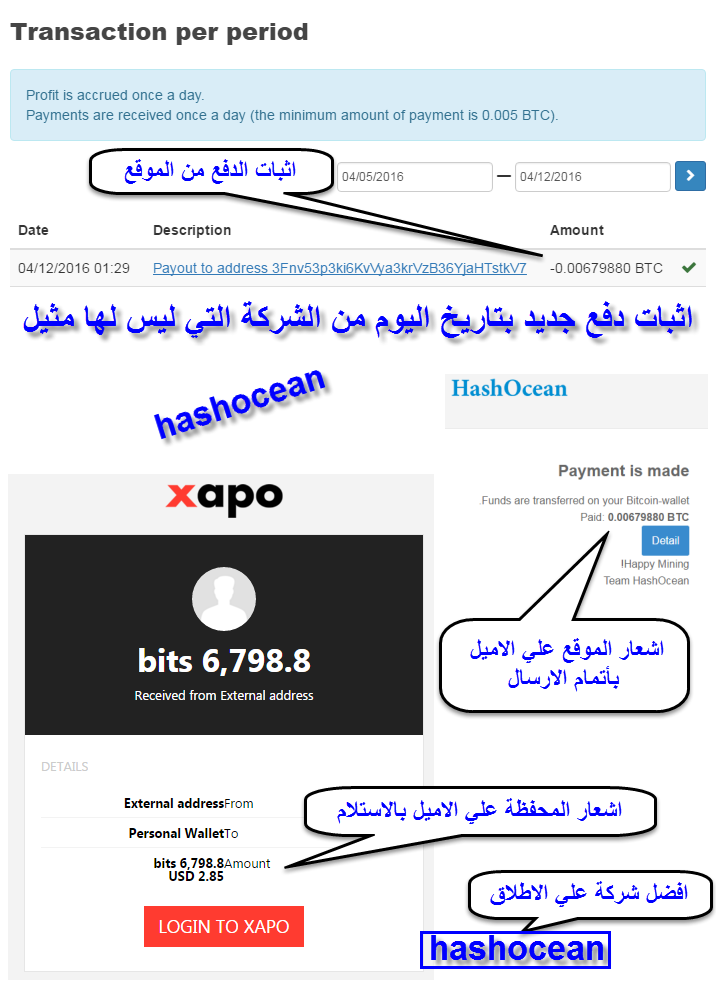 . . اثبات دفع من شركة hashocean بتاريخ اليوم 2016/4/27 بعد شراء KH/S 1200 بما يعادل 348$ دولار ما يقوم بأنتاج ربح يومي بهذه الطاقة = 4.05$ مدي الحياه وفي طموح بشراء المزيد من الطاقة فموقع hashocean تابع لشركة تعدين حقيقية وليس منة قلق وهو الاضمن والاصدق علي الانترنت بحسب خبرتي الاثبات من اشعار المحفظة علي الاميل http://irba7.com/upload/do.php?img=4617 بالتوفيق للجميع يا رب . . |