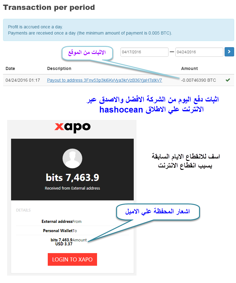 . . السلام عليكم ورحمة الله وبركاته اللهم صل على محمد وعلى آله وصحبه أجمعين اسف بسبب انقطاع الانترنت الايام السابقه لم استطيع رفع الاثبات اثبات دفع اليوم 2016/4/24 من افضل شركة لتعدين البيتكوين علي الاطلاق Hashocean تم بفضل الله تعالي شراء 1000KH/s بما يعادل 310$ دولار وما يتم انتاج بيتكوين يومي 3.37$ دولار يوميا مدي الحياه الاثبات بالصورة التالية http://irba7.com/upload/do.php?img=4610 بالتوفيق للجميع يا رب . . |