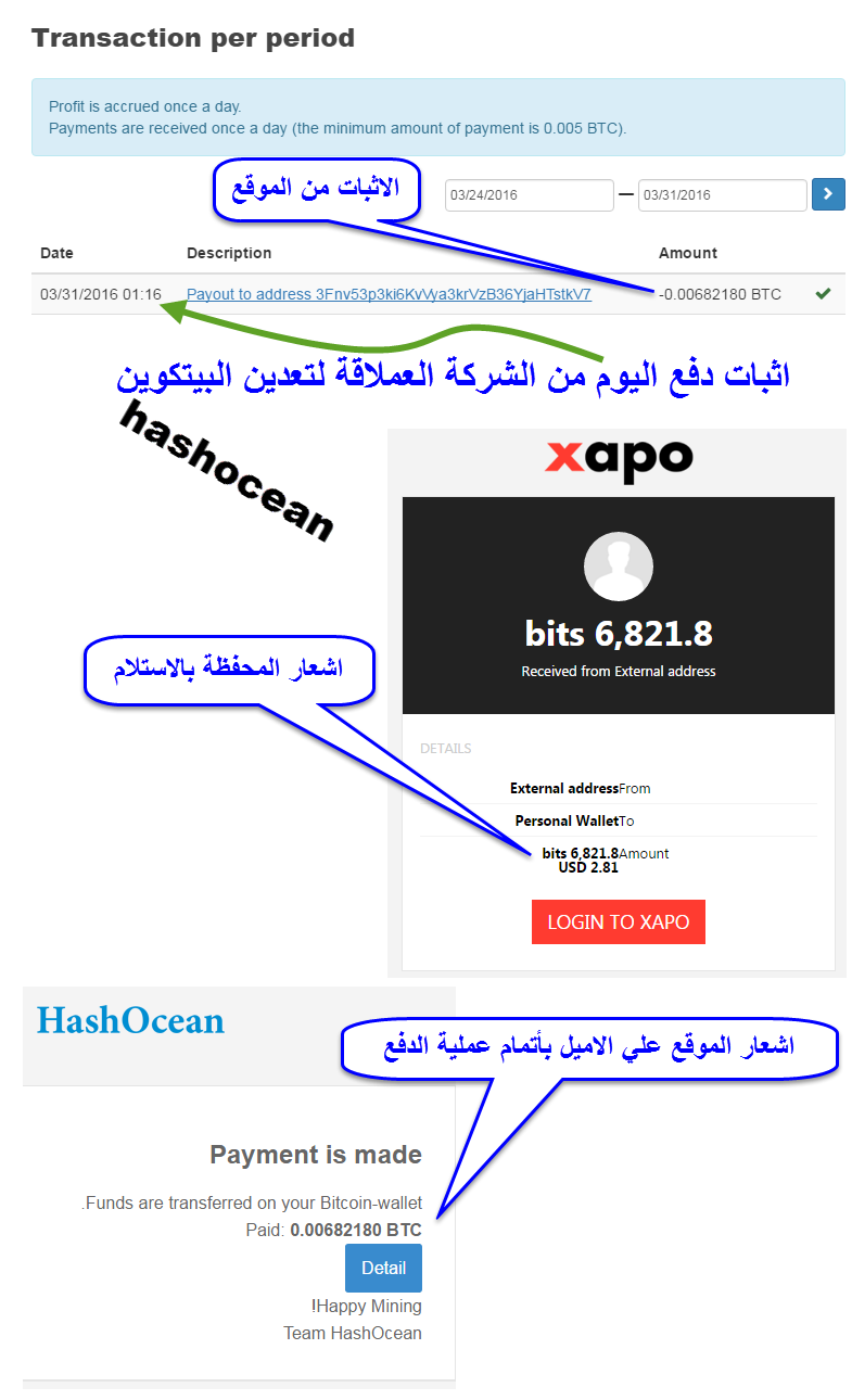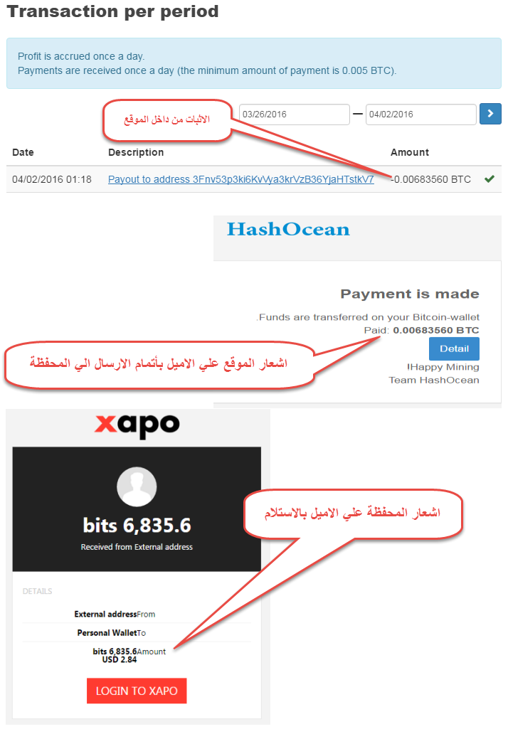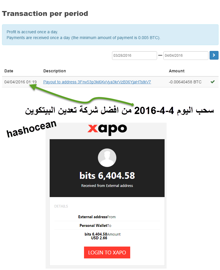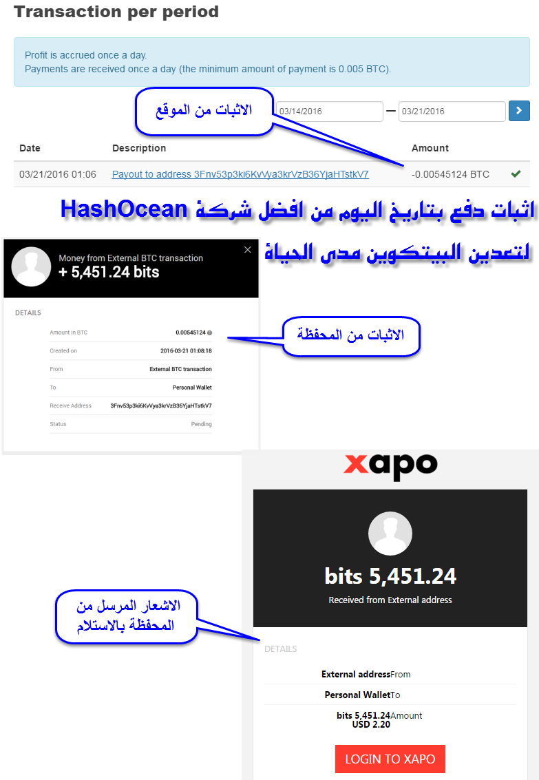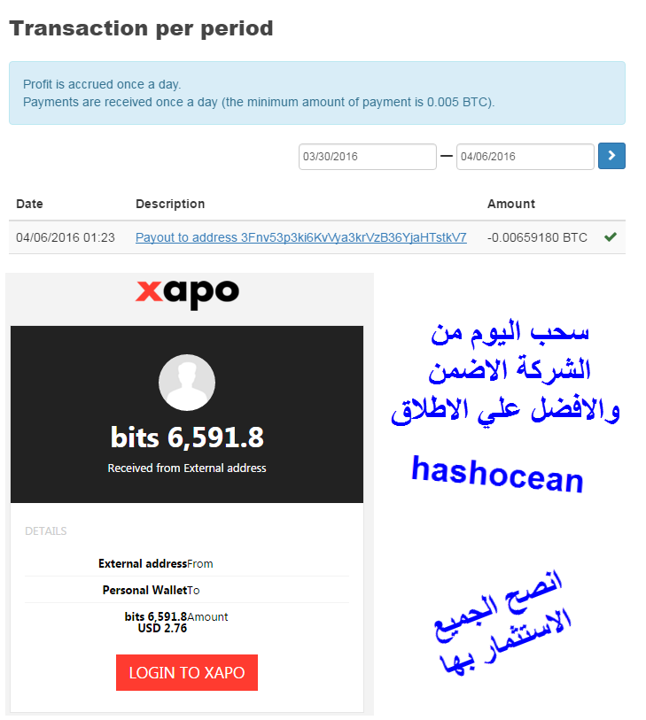 . . . اثبات دفع جديد بتاريخ اليوم 27/3/2016 من افضل شركة لتعدين البيتكوين شركة hashocean الاثبات بالرابط التالي http://store1.up-00.com/2016-03/145909605594821.png انصح الجميع بشراء اكبر كمية من الطاقة من الموقع فهو اكثر من صادق بالتوفيق للجميع . . |